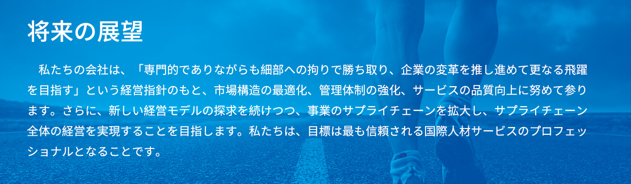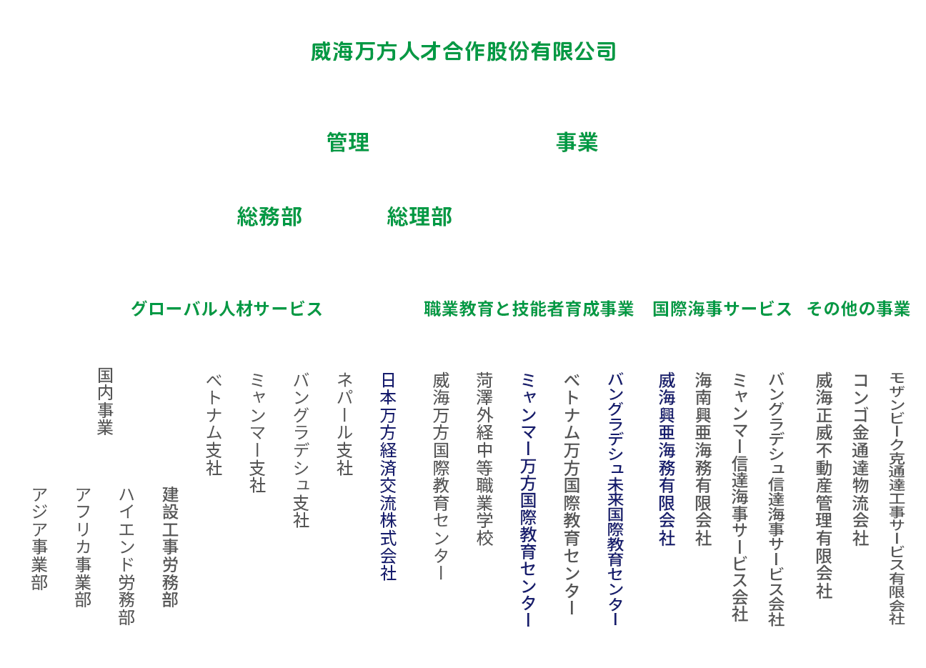 當社の事業(yè)內(nèi)容は、國內(nèi)外の人材派遣サービス(海外労働者送出事業(yè)を含む)、職業(yè)教育訓(xùn)練、國際海事サービス、不動産管理サービス、國際貿(mào)易、資本運営等、多岐にわたる分野に及んでいます。當社は2017年に持株制度への仕組み変更を?qū)g施し、2018年6月に全國中小企業(yè)株式譲渡システムに上場し、正式に資本市場に進出しました(証券コード:872813)。